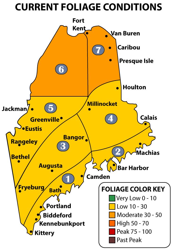Typically, northern Maine (zones 6 and 7) reaches peak conditions the last week of September into the first week of October. The rest of the state's progression of color will start occurring from north to south in mid-October. Coastal Maine typically reaches peak conditions mid-to-late October.