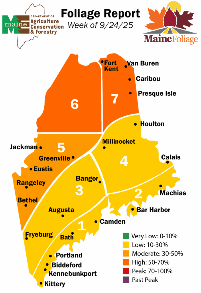 September 24, 2025 – With autumn’s arrival, Mainers and visitors can look forward to brilliant fall colors spreading across the state. The third 2025 Fall Foliage Report from the Maine Department of Agriculture, Conservation and Forestry (DACF) reports low to moderate color change (30-50 percent) throughout most of Maine with very low to low leaf drop (less than 30 percent). Northern Maine (zones 6 and 7) is showing significant color change (approaching 70 percent) with low leaf drop.