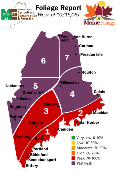 October 15, 2025 – The Department of Agriculture, Conservation and Forestry (DACF) has released its final foliage report for the season, indicating peak and past-peak conditions throughout most of Maine. As the weekend approaches, central and coastal areas are nearing peak color, with leaf drop now ranging from 70–100 percent.