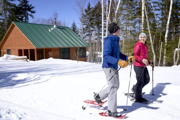 Exploring the forested Maine landscape on a pair of snowshoes or cross-country skis is the best way to explore the state’s wilderness. But raise it to another level with a cozy stay in a warm cabin at the end of the day. The Appalachian Mountain Club‘s (AMC) Maine Wilderness Lodges are an ideal combination of rustic charm and creature comforts. You can expect a wood-fired sauna, hot showers, and home-cooked meals. The lodges — Gorman Chairback, Little Lyford, and Medawisla — are each surrounded by cozy cabins. AMC’s lodges provide more than 80 miles of groomed ski trails, allowing extensive exploration by cross-country skis and snowshoes in the heart of AMC’s 100-mile Wilderness Conservation Lands. Maine Huts & Trails, three Alpine-inspired mountain huts in northern Maine, are ideal for snowshoers and cross-country skiers. Laid out on an 80-mile trail system, these cabins have woodstoves, a brightly lit and welcoming common room, hot showers, toilets, heated bunkrooms, and gear-drying rooms. Skiers and snowshoers can opt for either self-service or full-service accommodation.