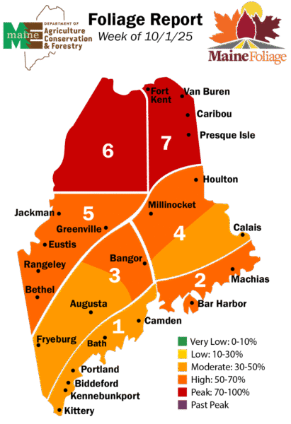 October 1, 2025 – With autumn in full swing, Mainers and visitors can look forward to brilliant fall colors spreading across the state. The fourth 2025 Fall Foliage Report from the Maine Department of Agriculture, Conservation and Forestry (DACF) reports moderate to high color change (50-70 percent) throughout most of Maine with moderate (less than 50 percent) leaf drop. Northern Maine (zones 6 and 7) is showing significant color change (approaching 70-100 percent) with moderate leaf drop.